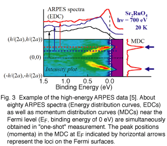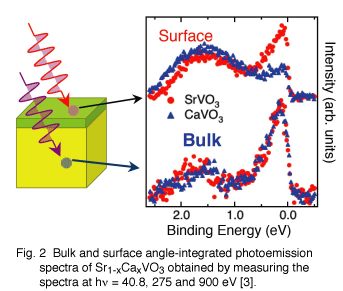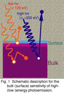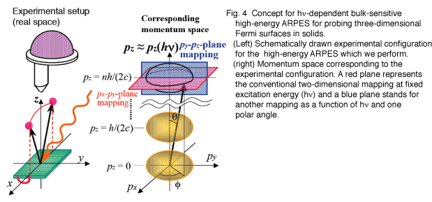Angle-resolved photoemission (ARPES) is known as a powerful tool to simultaneously detect the electronic dispersions (relations between the electron momentum and energy, namely, electronic structures) and the Fermi surfaces [1]. However, conventional low-excitation energy (hν ≲ 120 eV) ARPES mainly reflects the surface electronic states, which are often noticeably deviated from the bulk states for strongly correlated materials. Since the bulk electronic structures are responsible for the physical properties in solids, a technique for probing the bulk electronic structures is very important for studying solids. In order to overcome the surface sensitivity, high-excitation energy photoemission is promising due to the longer photoelectron escape depth [2] as shown in Fig. 1. Indeed, we have so far measured surface-sensitive low-energy and bulk-sensitive high-energy angle-integrated photoemission spectra reflecting the electron density of states in the solids for strongly correlated transition metal oxides Sr1-xCaxVO3 (Fig. 2), demonstrating the qualitative differences in the electronic states between the bulk and surface [3]. Here we show that the power of high-energy ARPES applied for a Ce-based strongly correlated material to clarify the bulk three-dimensional electronic structures and the Fermi surfaces.