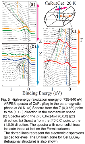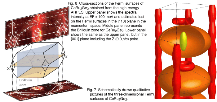 Figure 5 shows the high-energy ARPES spectra (EDCs) of CeRu2Ge2 in the paramagnetic phase. We can recognize that the energy positions of many peaks and shoulders in the spectra are changed depending on momentum. These peak energies as a function of momentum reflect the electronic dispersions. In addition, these structures change three-dimensionally in the momentum space, which is indication of the bulk electronic dispersions since the surface electrons are expected not to disperse along the pz direction in Fig. 5(b). From the ARPES measurements, we have obtained the cross-sections of the Fermi surfaces for CeRu2Ge2 at the high temperature (20 K) along the [110] and [001] planes including the Z (0,0,h/c) point in the momentum space as shown in Fig. 6. From these cross-sections, small and large ellipsoidal Fermi surfaces centered at the Z point, and small cylinder-like Fermi surfaces centered at the X (h/(2a),h/(2a),0), point are expected. Based on the high-energy ARPES results displayed here, we can obtain the qualitative shapes of the three-dimensional Fermi surfaces for CeRu2Ge2 in the paramagnetic phase as shown in Fig. 7. Although the ellipsoidal Fermi surfaces are similar to those in the magnetic phase [8] and in a theoretical result based on a localized 4f model [9], it is found that the cylinder Fermi surfaces are qualitatively different from those in the different phase and in the theoretical result.